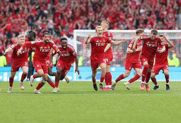 Funny game, football. Tied at 1-1 after extra-time, Dimitar Mitov’s saves from Celtic’s Callum McGregor and Alistair Johnston in the sudden-death penalty shoot-out sent interest levels surging higher than the northern lights. The city of Aberdeen now fell fully back in love with its football team.