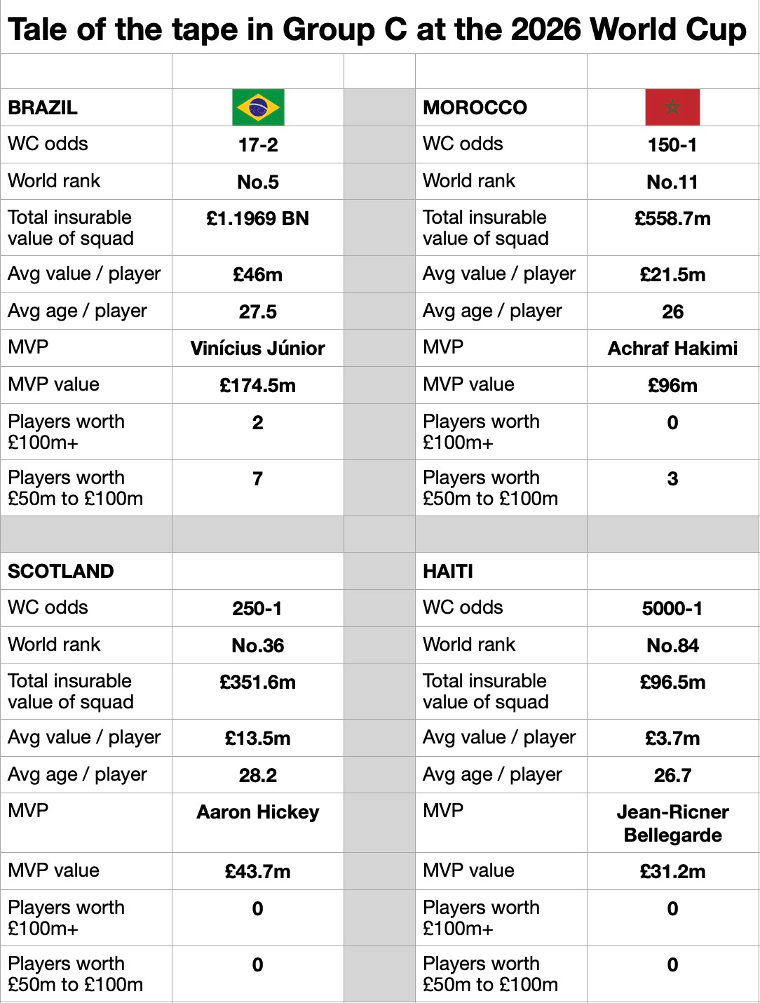 The insurable values of the squads also predict that outcome, with Brazil’s players collectively worth £1.2billion in insurance terms (a long way short of their £2bn+ valuation at the 2022 World Cup), Morocco’s worth £558.7m, Scotland’s £351.6m and Haiti’s £96.5m.