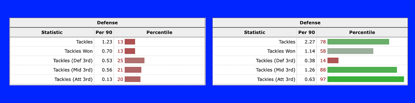Compare his defensive numbers to last season, and those are two entirely different players. He’s now in the very, very top echelon of Serie A for winning the ball in the opposition’s final third, and pushing into the top 20% for just tackles overall.