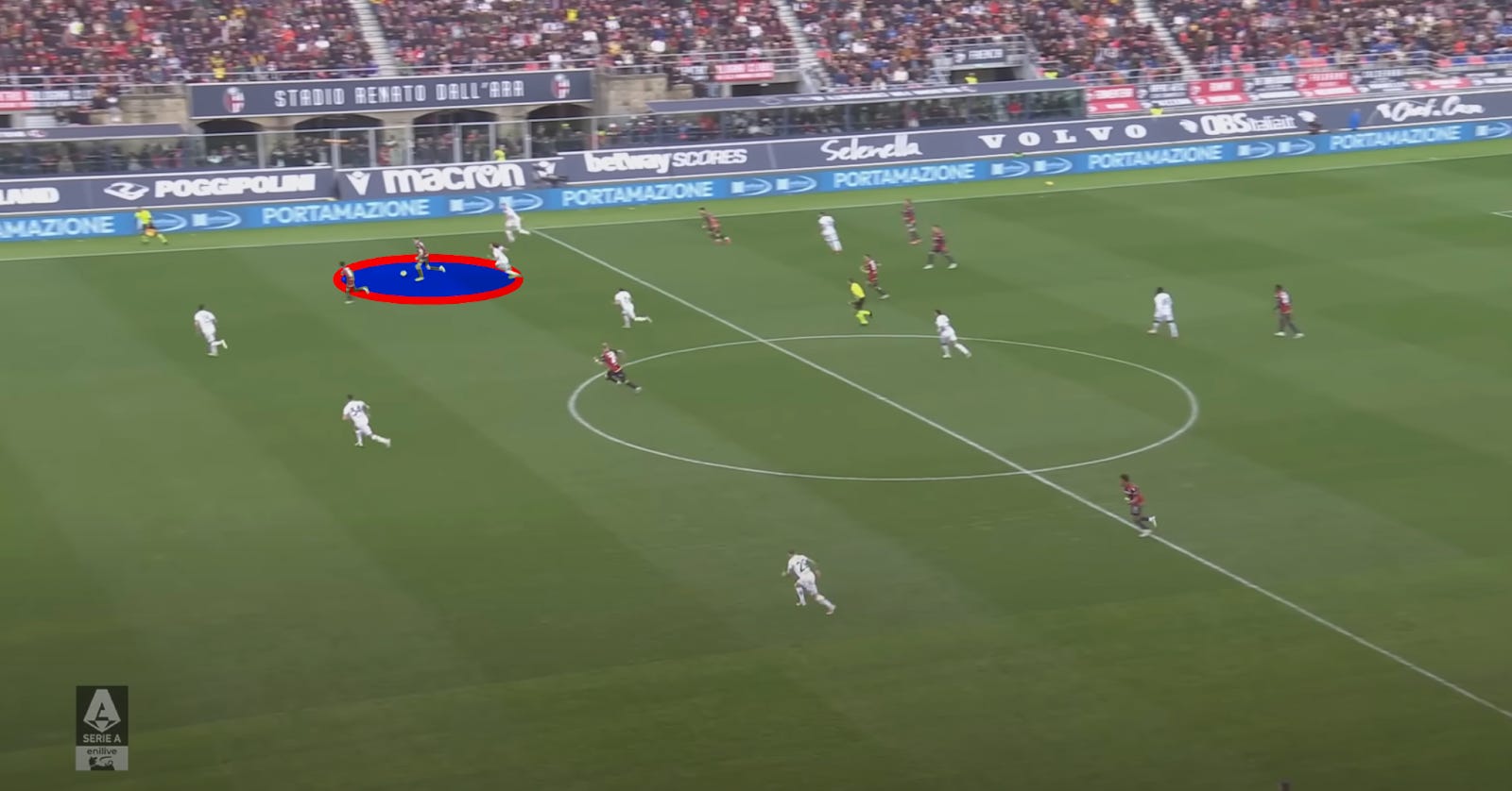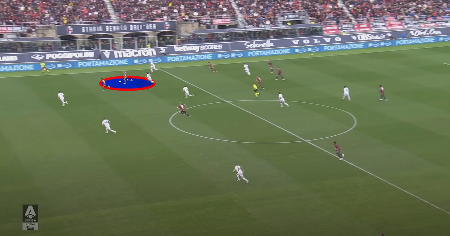 But out of possession, he’s a vital cog in their frankly insane pressing structure — regularly pushing well out of his position to pounce on loose touches and errant balls to get Bologna charging up the field on a turnover.