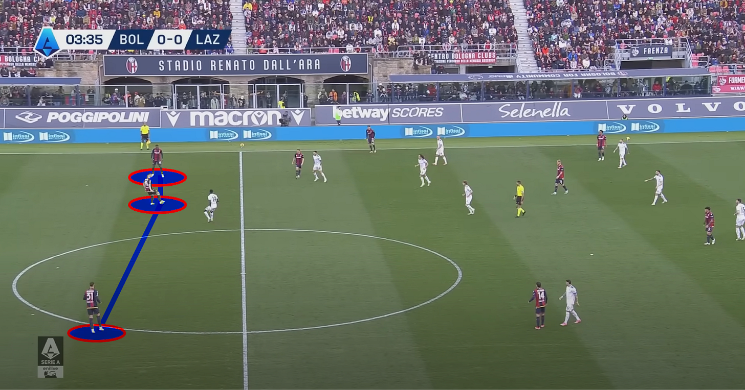 Like, genuinely, compare those two images. It’s the same player, in the same game, performing two parts of the same role. There aren’t many, if any, other players in Europe charged with being a key part of the initial build-up, and one of the more aggressive elements of the press. Sandro Tonali at Newcastle, Thomas Partey at Arsenal… I’m struggling now… Warren Zaire-Emery? Lucas Paqueta? Sort of. Jude Bellingham when he’s in a huff? It’s one of the rarer profiles in football at the minute and Bologna (plus Scotland!) have someone excelling at it.