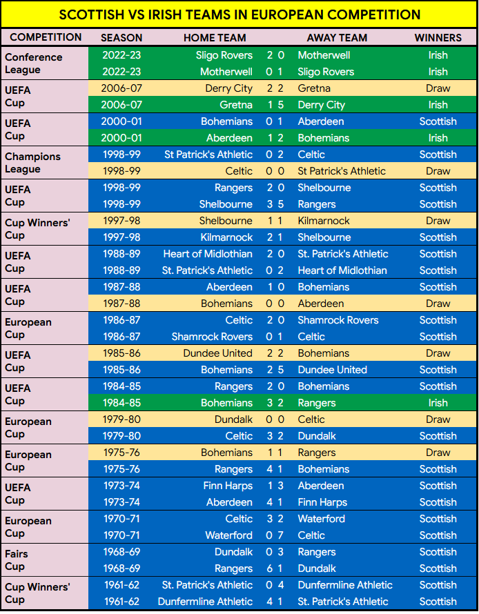 There have been 34 Scottish v Irish encounters in European club football. Scottish teams have only lost five of these matches. However, four of those Scottish losses came this century, and of the last six meetings there has only been one Scottish victory — even that was a 1-0 win for Aberdeen in Dublin that suited Bohemians, who progressed via the away goals rule (after playing the second half with 10 men).