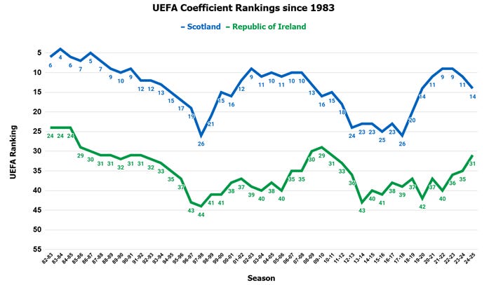 Since the UEFA coefficient was officially introduced in 1979, the Republic of Ireland’s league has never broken into the top 20. By contrast, Scotland has been outside the top 20 for only two periods (1997–99 and 2013–19) and reached as high as third place four times in the 1960s. Over 66 seasons, Scotland has finished in the top ten 31 times.