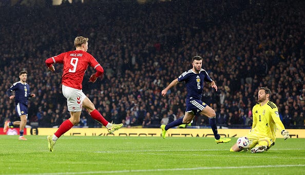 With no Gannon-Doak to scurry down the right channel, Scotland had no out ball. Long balls were thumped up the park, surrendering possession to the opposition. Dorgu was now free to provide another Danish attacking outlet, claiming the goal which so nearly condemned Scotland to the play-offs.