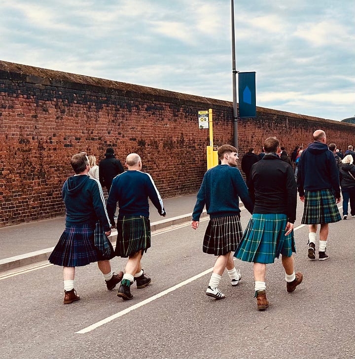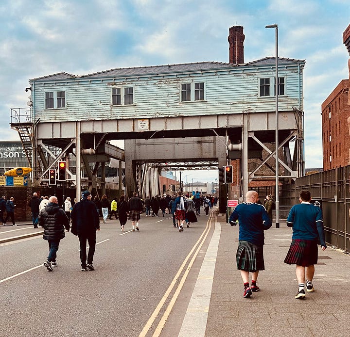 Then came the march one and a half miles upstream to the Hill Dickinson Stadium. Thousands stomped by vast and lanky old walls with their rusty gates to nowhere, tracing the steps of so many yesteryear dockers. Bars that have sprung up to profit from Everton’s flit blared Yes Sir, I Can Boogie to entice visitors, but it felt as though Scotland needed new songs. “Hats and scarves, cash and card” barked street vendors bearing orange and blue half-and-halves. Fans gathered on the pristine plaza outside the main stand, some pleasantly deep in beer, others intoxicated by being somewhere else, somewhere new.