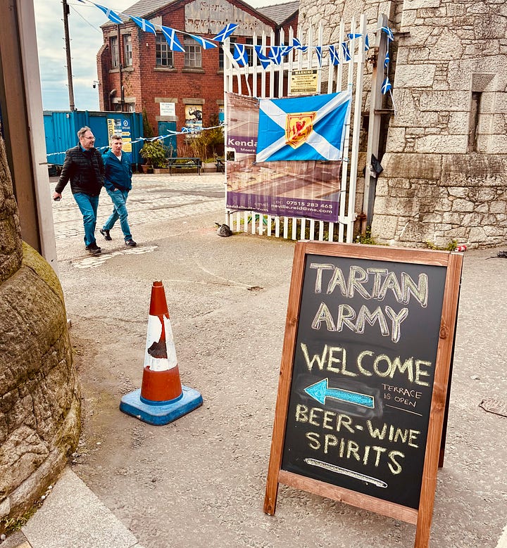 Yet more content Caledonians dawdled down by the Mersey. There, in that milky light which has always made this a place for dreaming, kilted and capped they waved their Saltires at bemused passengers aboard a cruise ship who quite possibly thought they had mistakenly docked at Greenock. Some Scots queued to have their photos taken with sculptures of the Fab Four. “There’s quite a lot of Beatles stuff here, Dad” said a boy of 11 or 12. He was one among many youngsters today receiving an away days education rather than a classroom one. Seldom have so many dental appointments been phoned in, or notes declaring attendance at far-off funerals submitted.