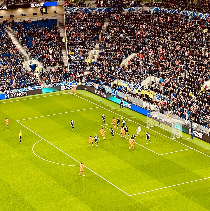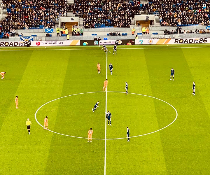Then, the game drifted into a stupor. At times, it could not even be regarded as proceeding at walking pace; instead, it rattled along with the slow and dispiriting murmur of a faulty Stannah stairlift. The crowd quietened. Existential questions wrought inner turmoil. Why were Scotland playing a game in England? Which berserk masochist invented international friendlies? Was it the grey wheelie bin this week, or the green one? Back on the pitch, Gilmour snapped into a challenge with gusto and it shocked us all, a bedroom light switch flicked suddenly in the dead of night.