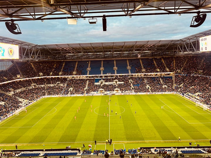 Then, we were in, inside a glossy blue world where sentry lines of seats sweep for the clouds. Every smidgeon of the stadium is organised, calculated. If Goodison Park was your grandma’s flat, full of beloved knick-knacks but whiffing slightly of Silk Cut, then the Hill Dickinson is a chain hotel, spotless but staid. Only time will give it the flaws, crow’s feet, yarns and memories that make a house a home. Yet an airtight arena like this has one instant advantage — noise gathers rapidly and cannot escape. Tunes kept by two or more ends radiate and then cascade to the turf, as they did now when Scots behind both goals chorused for their nation ahead of kick-off.