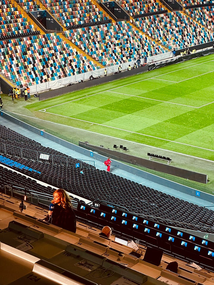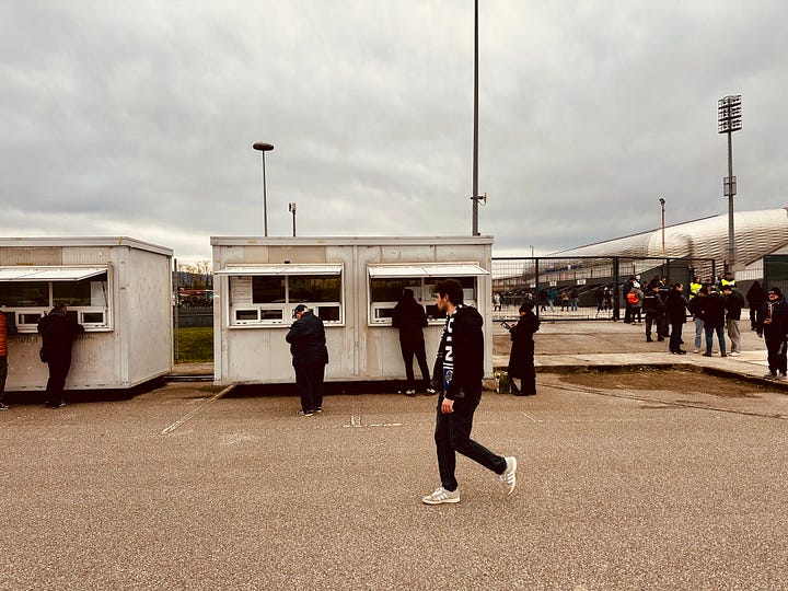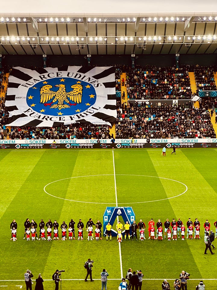 Kick-off neared and foil rustled. Leftovers on the way home is perhaps another sacred ritual, stale bread suddenly delectable after a victory. Supporters walked towards the bulbous steel of the modernised Stadio Friuli, itself resembling foil scrunched around a giant focaccia. On merchandise stalls, Udinese shirts hung from rails jerked in the breeze as if trying to follow them. A father and son stopped at one such stand before finally the boy’s grandad tottered near, waving his wallet in the air. I imagined the lad still wearing the scarf his nonno bought him half a century from now.