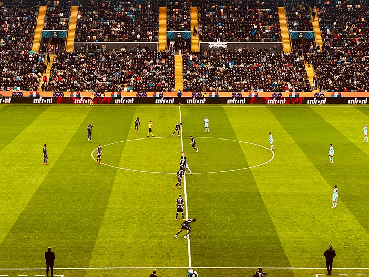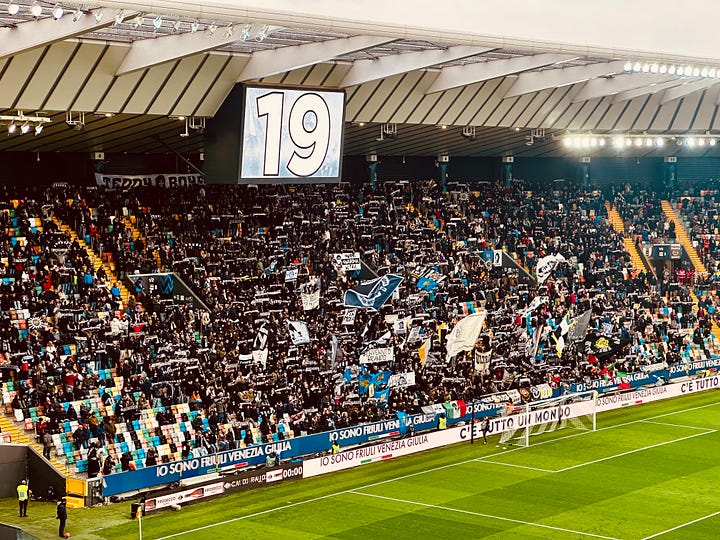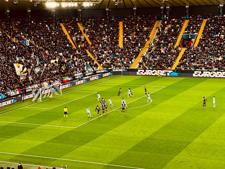 The big man in the tiny Fiat tooted a symphony on his horn as if he had news to spread. At speed he jolted across the scrubland car park next to the stadium. When he encountered particularly bumpy terrain, his head struck the vehicle’s ceiling. Halted, the man tipped himself uneasily out — it brought to mind a fly attempting to escape from a cobweb — and lifted a black and white scarf skywards. “Udinese alè, alè” he sang several times over, “Udinese alè!” From cities beneath the snowy Alps to dusty sunshine towns, matchday makes happy clowns of us all.